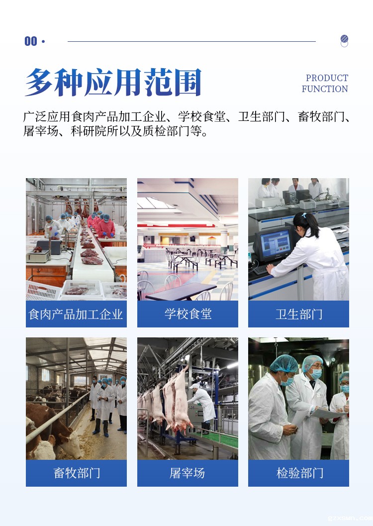该多功能肉类检测仪为集成化肉品安全快速检测分析设备,广泛应用于各类商超、批发市场、养殖场、屠宰场、食品肉产品深加工企业、检验检疫部门、食药监局、卫生部门、高教院校、科研院所、农业部门等单位使用。