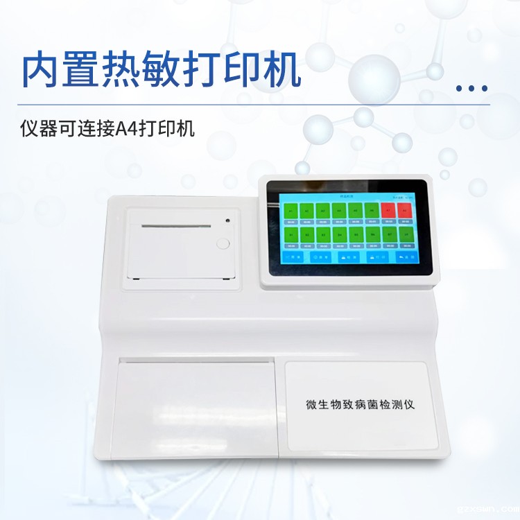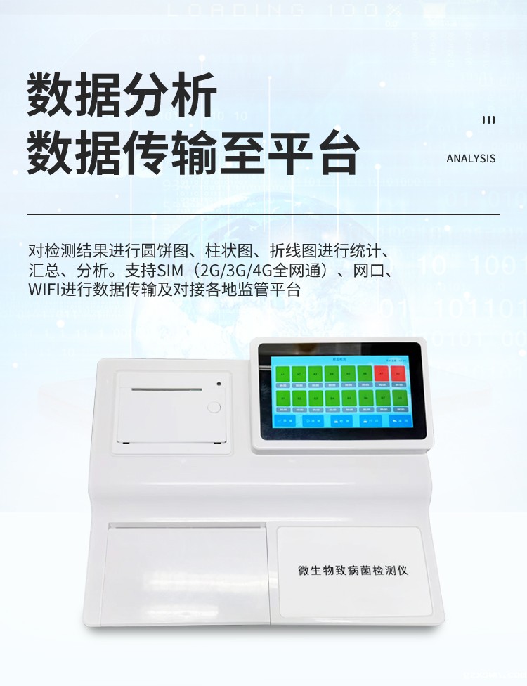 25、打印功能:内置热敏打印机,可通过USB B型外链打印机,单条或多条数据合并打印,可打印检测结果检测报告可打印检测项目、样品名称、检测结果、结果判断、检测日期 、检测单位、检验人员、被检测单位等信息;USB B型接口可连接A4打印机打印结果