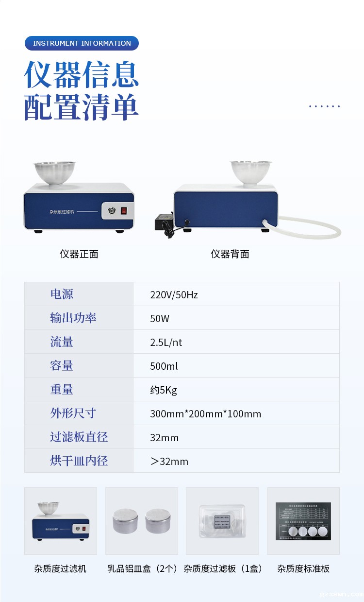主机一台,乳品铝皿盒二个,杂质度过滤板一盒,杂质度标准板一张,杂质度标准板使用说明一份,杂质度过滤机使用说明书一份,实验规范一份,合格证一张)