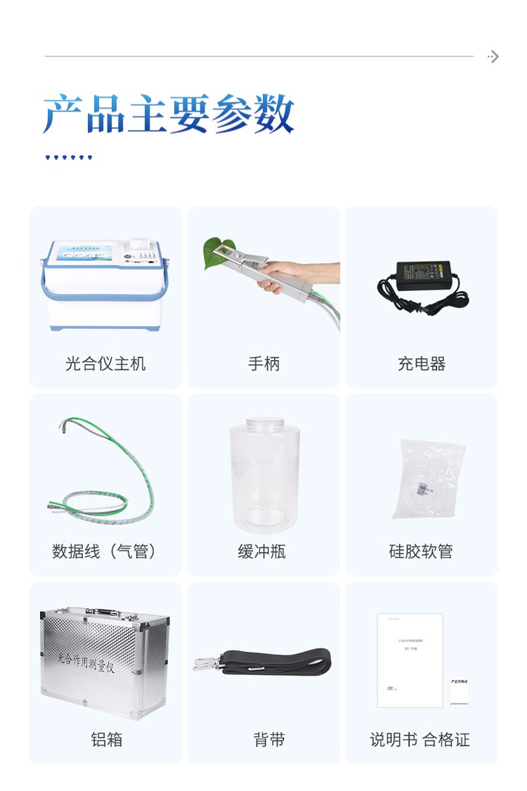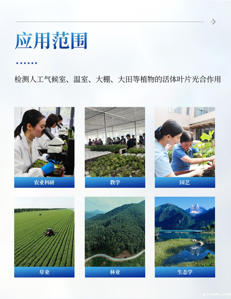 简要描述: 植物光合作用测定仪是一款检测人工气候室、温室、大棚、大田等植物的活体叶片光合作用的实验仪器,测定内容包括空气CO2浓度、环境温湿度、叶室温湿度、叶面温度、大气压力、光合有效辐射(PAR)、叶片光合速率(Pn)、气孔导度(Gs)、叶片蒸腾速率(Tr)、胞间CO2浓度(Ci)、水分利用率(WUE)、呼吸速率(Rd)、蒸腾比(TR)共15项参数,可用于植物生长生理、光合生理、胁迫生理研究等科学研究,植物光合作用测定仪适用于农业科研、教学、园艺、草业、林业以及更广泛的领域。