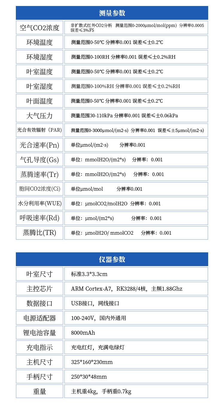 叶室湿度:测量范围0-100%RH 分辨率0.001 误差≤±1%RH