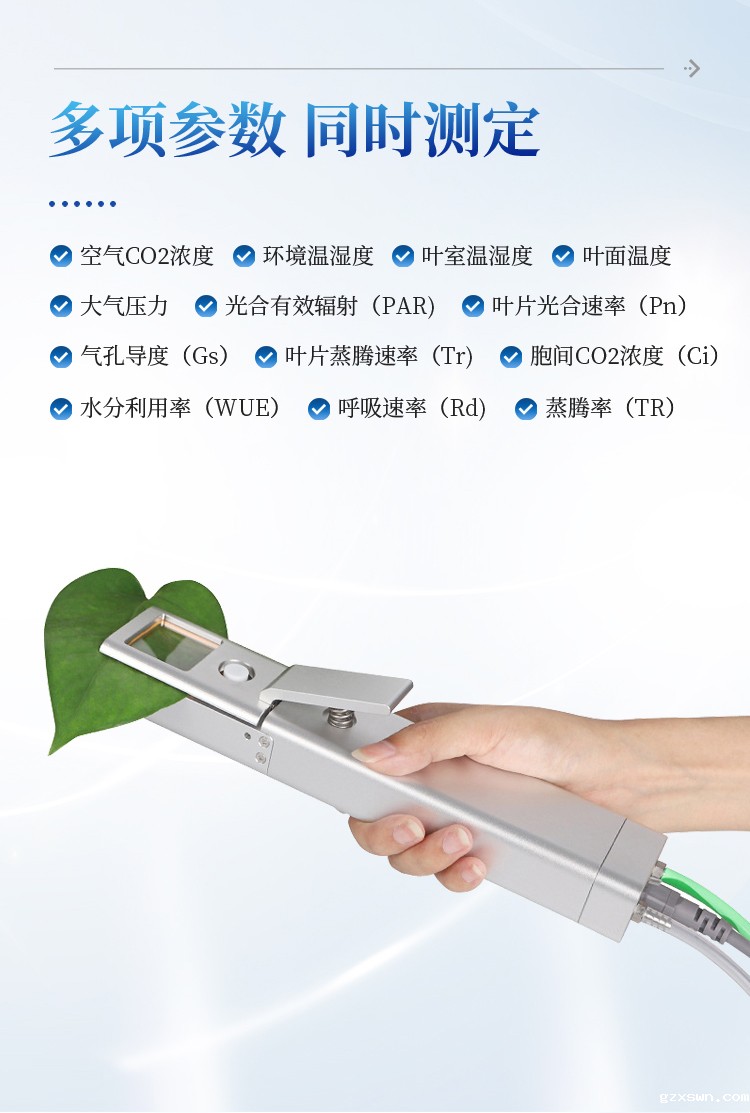 多功能:同时测定光合速率、蒸腾速率、胞间二氧化碳浓度、气孔导度和水分利用效率,以及二氧化碳浓度、相对湿度、光合有效辐射和空气温度、叶片温度、大气压力等指标;