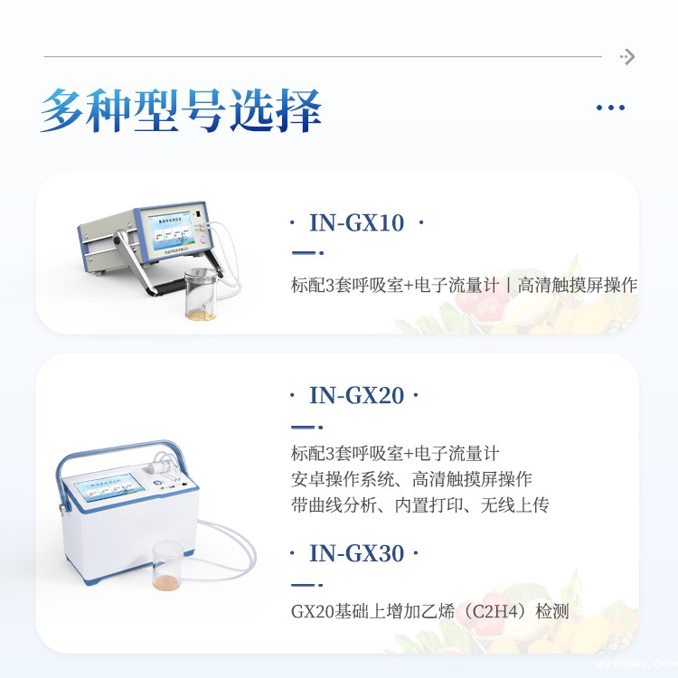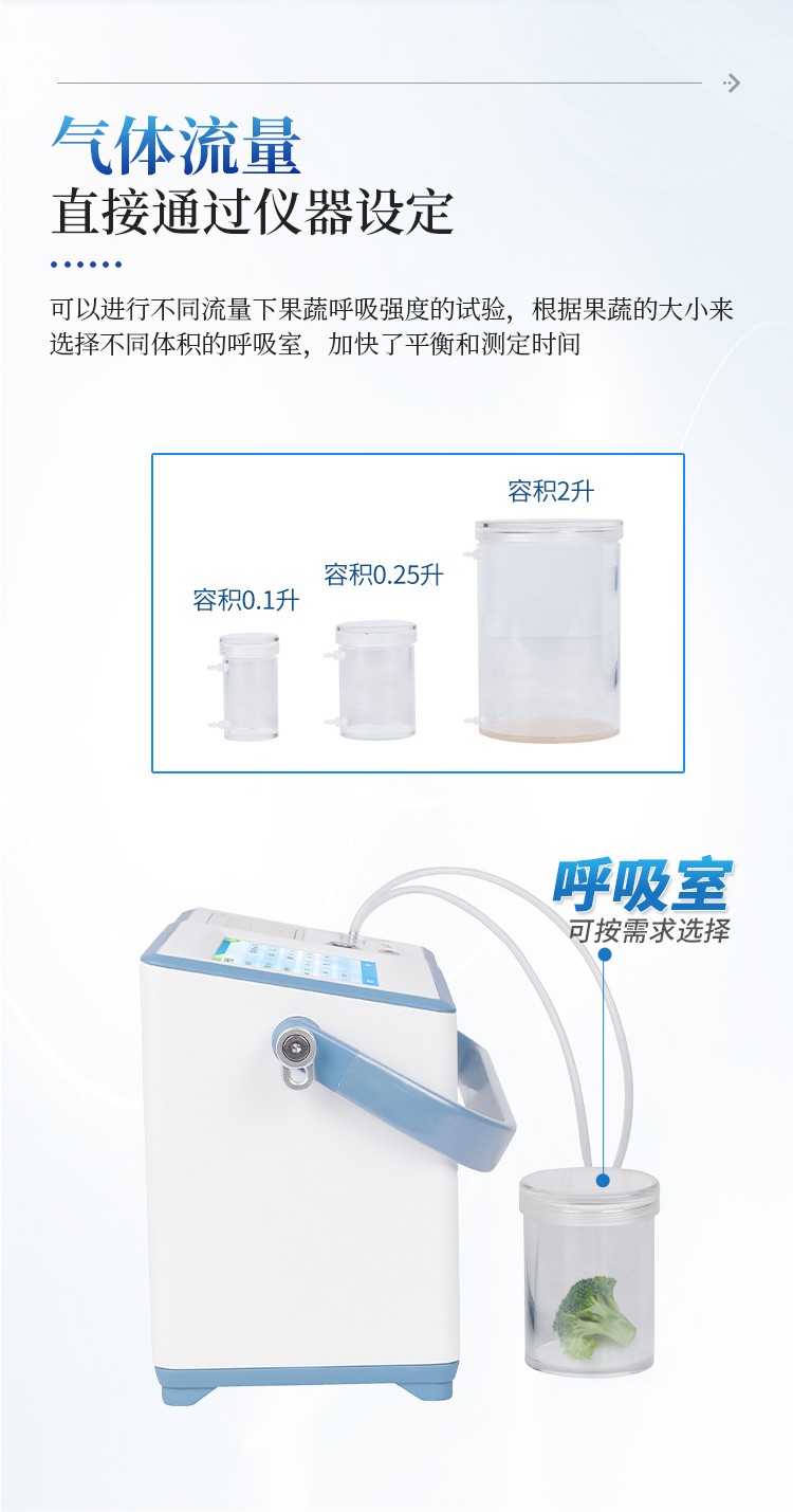 该仪器的特点是可以根据果蔬的大小来选择不同体积的呼吸室,加快了平衡和测定时间;可以直接操显示呼吸室的CO2浓度、O2浓度、C2H4浓度、温度和湿度及变化曲线。