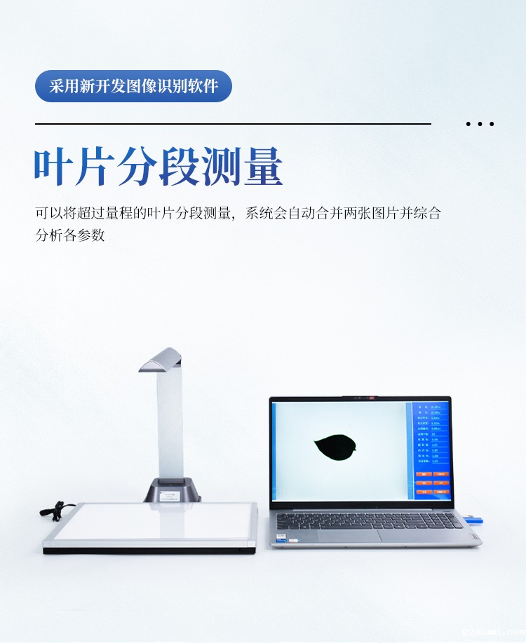 大叶片分段测量:可以将超过量程的叶片分段测量,系统会自动合并两张图片并综合分析各参数