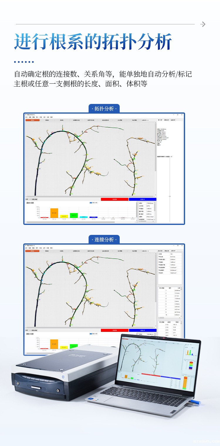 (15)能进行根系的拓扑分析,自动确定根的连接数、关系角等,还能单独地自动分析主根或任意一支侧根的长度、面积、体积等,可单独显示标记根系的任意直径段相应各参数(可不等间距地自定义)。