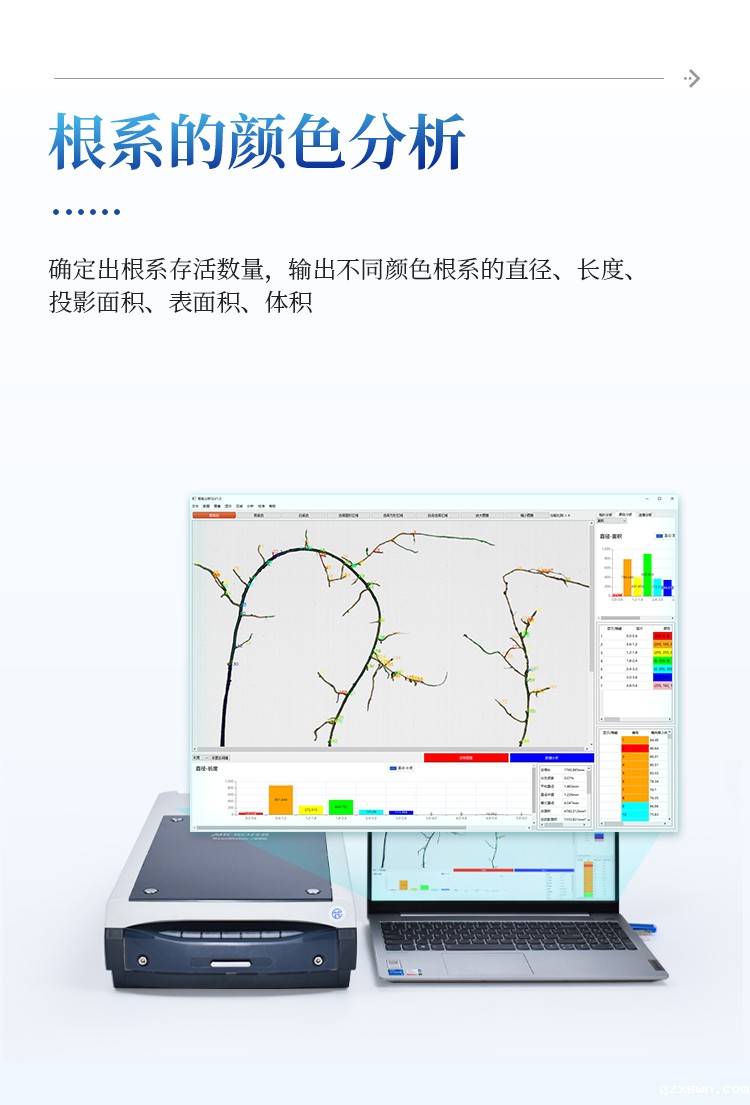 根系分析系统用于洗根后专业根系分析,还可以用于根盒培养植物的根系表型分析,可以分析根系长度、直径、面积、体积、根尖记数等,功能强大,操作简单,软件可分析植物根系的形态分析及根系的整体结构分布等,广泛运用于根系形态和构造研究。