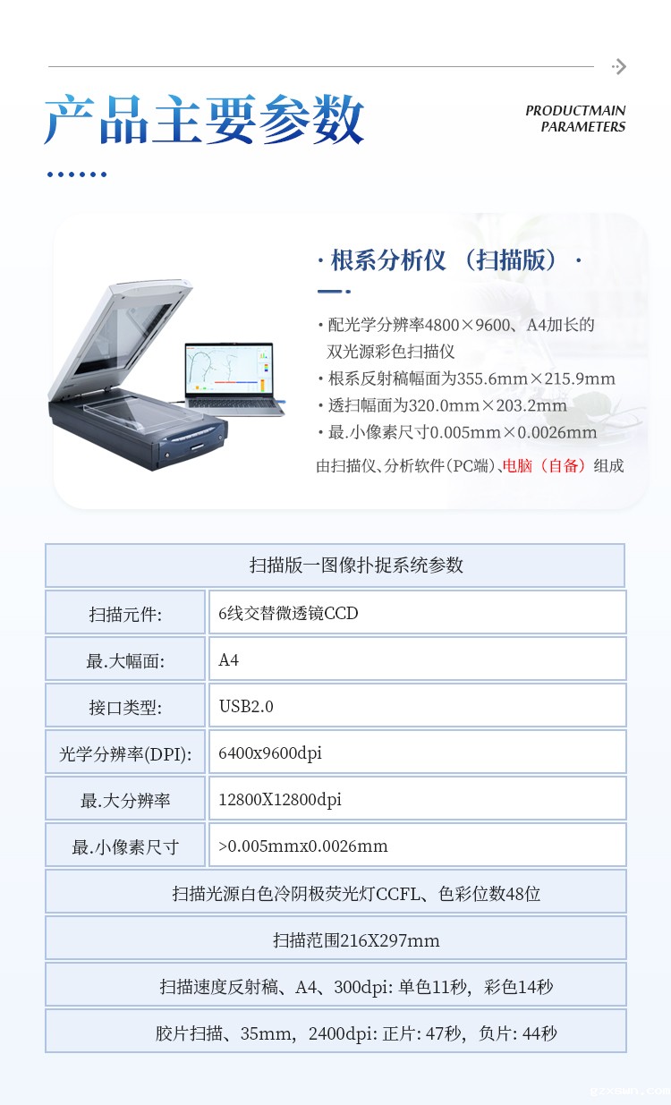 1、配光学分辨率4800×9600、A4加长的双光源彩色扫描仪。根系反射稿幅面为355.6mm×215.9mm,透扫幅面为320.0mm×203.2mm,最小像素尺寸0.005mm×0.0026 mm。
