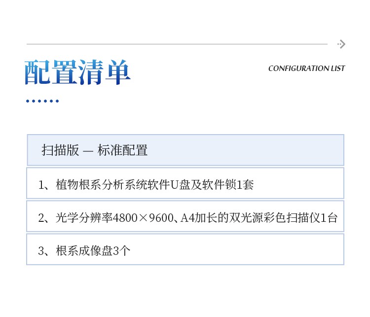 根系分析系统利用高质量图形扫描仪获取高分辨率植物根系彩色图像或黑白图像,该扫描仪在扫描面板下方和上盖中安装有专门的双光源照明系统,并且在扫面板上预留了双光源校准区域。此外,还配备有不同尺寸的专用、高透明度根系放置盘。扫描时,扫面板下的光源和上盖板中的光源同时扫过高透明度根盘中的根系样品,这样可以避免根系扫描时容易产生的阴影和不均匀等现象的影响,有效地保证了获取的图像质量。