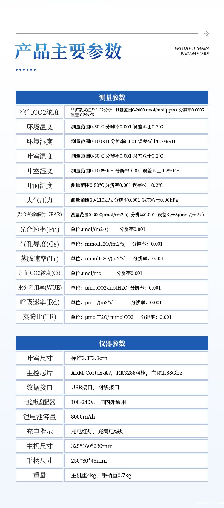 叶室湿度:测量范围0-100%RH 分辨率0.001 误差≤±1%RH