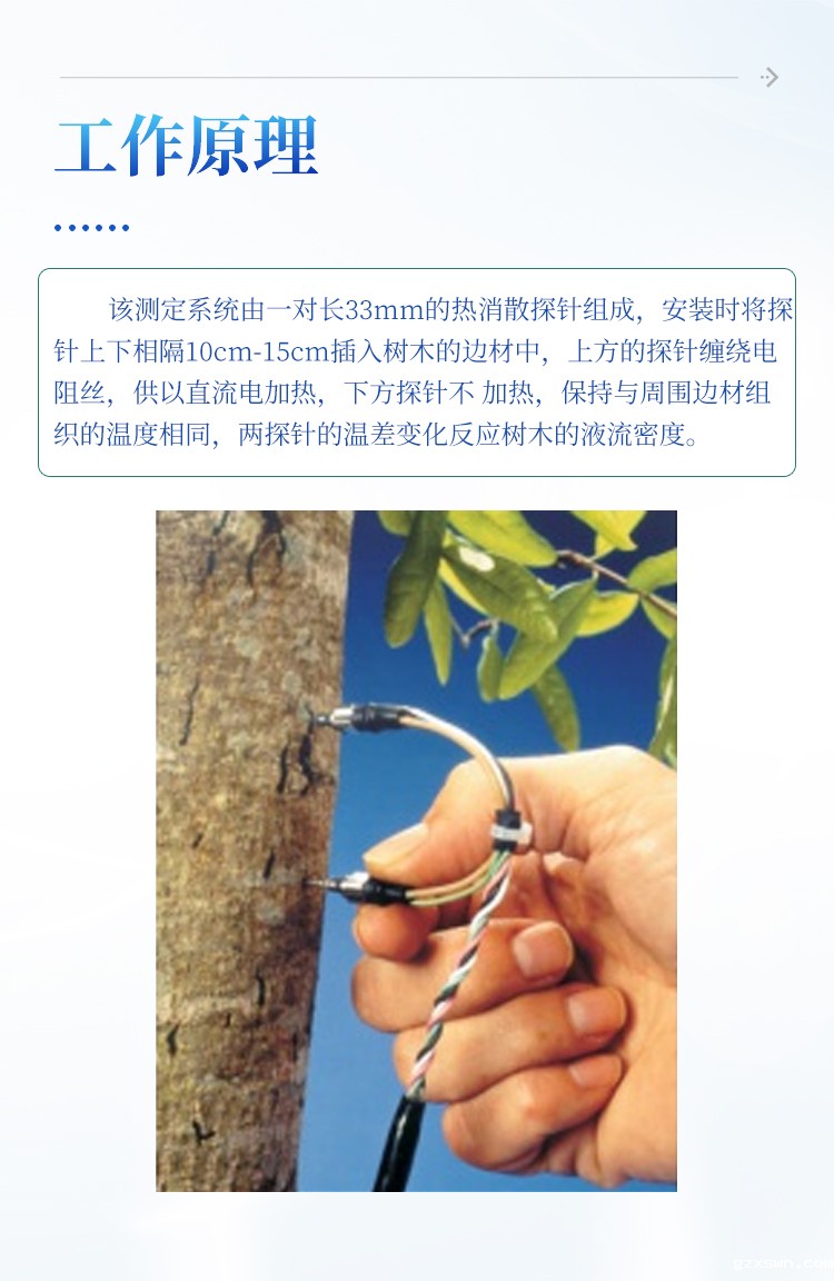 采用法国学者Granier在20世纪80年代后发明的一种测定Sap Flow的新方法,即热消散探针法(恒定热流传感器法)。该方法的数据采集具有准确稳定的特点,而且可以连续不间断的读取数据,因而数据具有系统性。该测 定系统由一对长33mm的热消散探针组成,安装时将探针上下相隔10cm-15cm插入树木的边材中,上方的探针缠绕电阻丝,供以直流电加热,下方探针不 加热,保持与周围边材组织的温度相同,两探针的温差变化反应树木的液流密度。