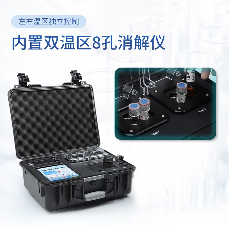4、内置双温区8孔消解仪,左右温区独立控制,可对COD氨氮总磷等进行快速消解。